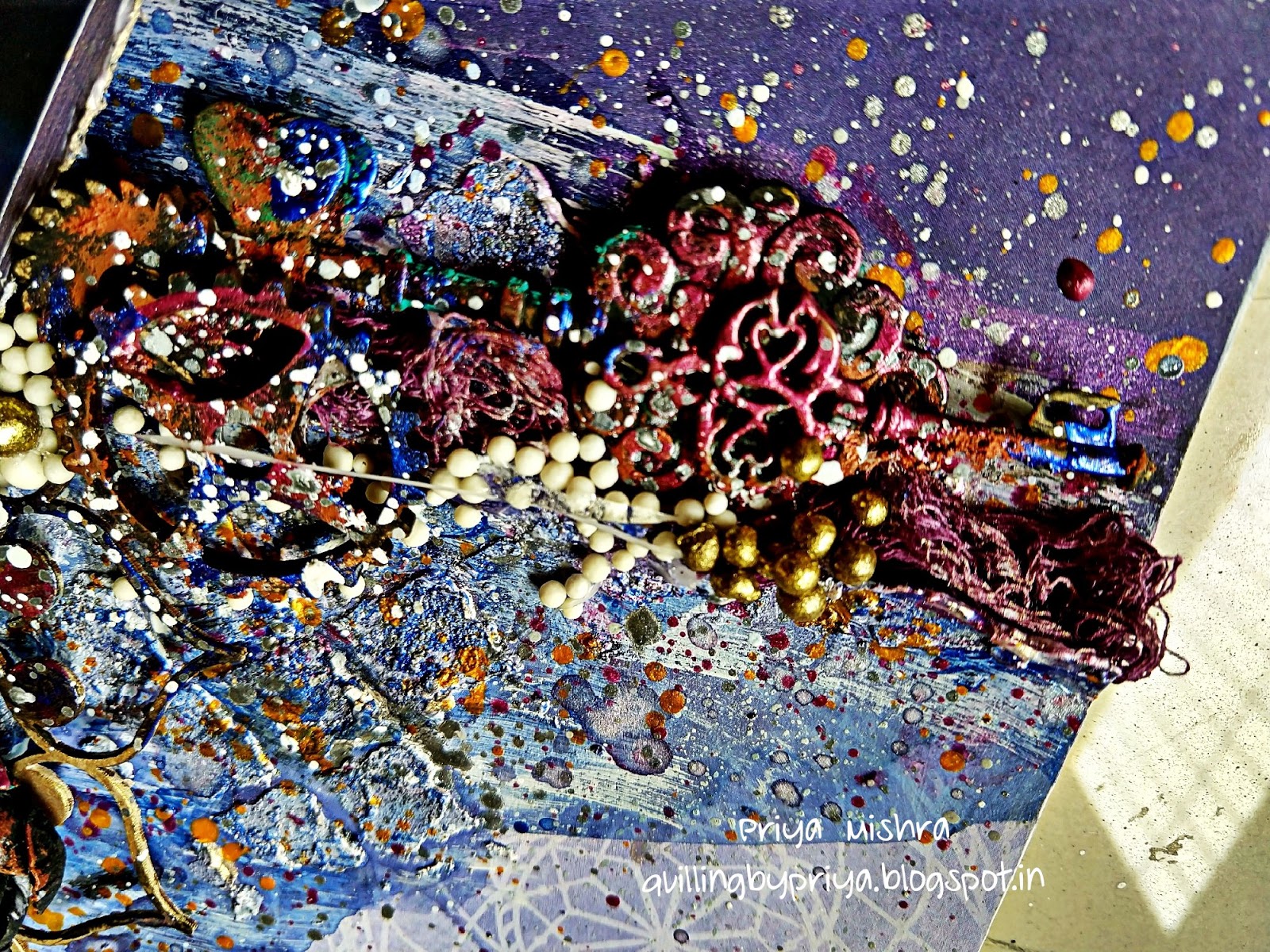 From my stash I used Metal embellishments, Flowers, chipboards, Art Stones, Stencil.